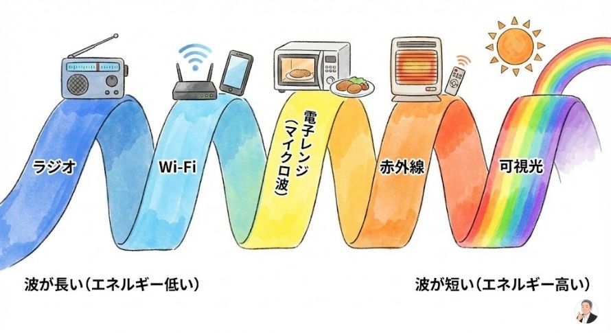 これらはみんな“同じ家族”。違いはざっくり言うと 波の細かさ(周波数)の違いなんだ。