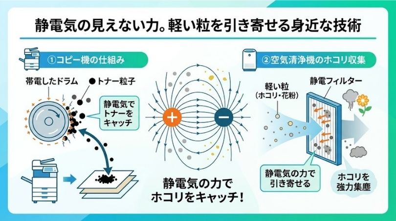 細かな粒を決まった場所へ動かしたり、のせたりする考え方の中で、静電気の性質が使われることがあります。