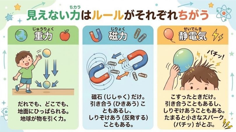 ここまで読むと、重力、磁石、静電気はどれも「見えないのに物を動かす」という点で少し似て見えます。