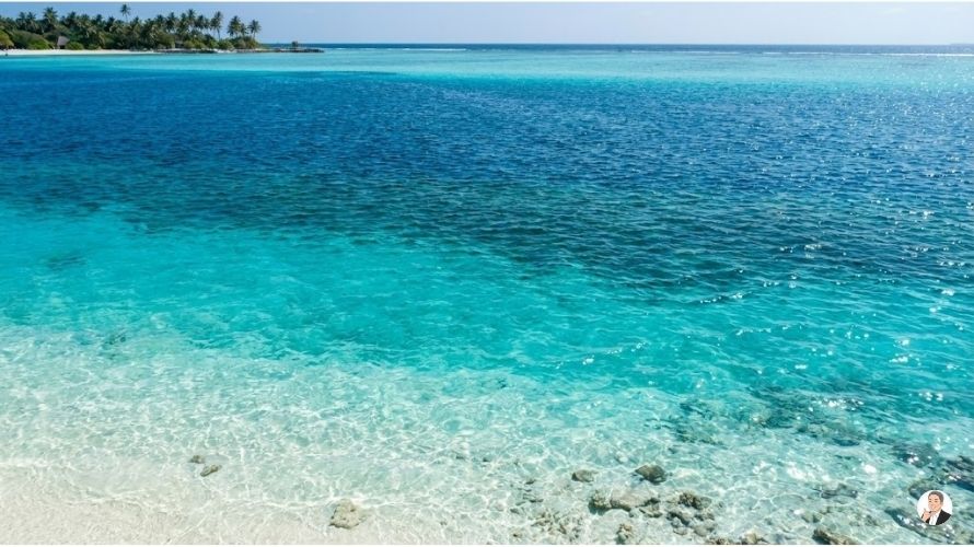 - 浅瀬では砂や珊瑚の反射で明るい水色。