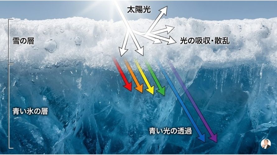 - 南極や氷河では、厚い氷の層の中ほどが青く見える。これは赤の光が吸収され、青が残るから。