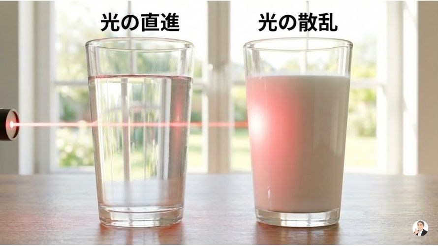 - 牛乳を加えると、光が粒にぶつかって散乱し、白く濁る。