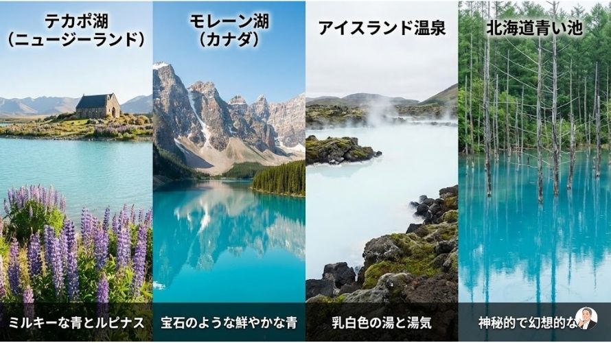 - ニュージーランドのテカポ湖:氷河の粉(ロックフラワー)が光を反射→“乳青色”